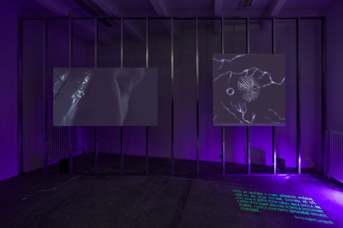A two-channel video installation presents the phenomenon known as phosphenes or internal sight. Matěj Pavlík and Lucie Rosenfeldová exposed this phenomenon to the historical perspective of Western scientific knowledge, focusing on the forms of imagination of the body and corporeality it can serve to establish. The Technology of the Self-Touching of the Eye exhibition, by the artistic duo of Matěj Pavlík and Lucie Rosenfeldová, uses the phenomenon of the phosphene to demonstrate the extent to which human perception is influenced by ideological, social, and cultural factors. Phosphenes – a term originating in Greek, where phos refers to light and phainomenon refers to a phenomenon – could be described as black spots of light brought about by pressure on the eyes. The origin and influence of these colourful shapes have been studied by philosophers, scientists, and doctors since antiquity.